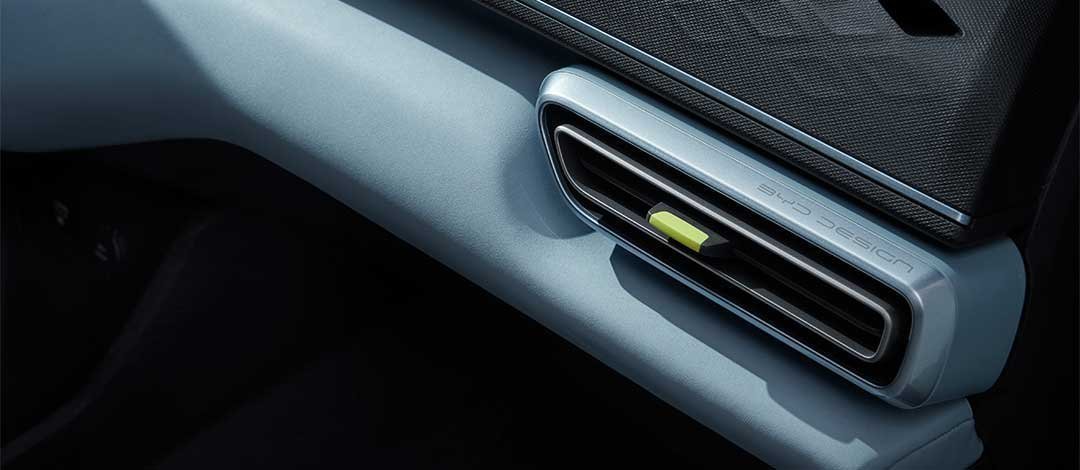 Ventilasi AC BYD Atto 1 bergaya cyberpunk dengan garis tegas dan aksen warna modern, menciptakan atmosfer kabin yang futuristik, penuh energi, dan berkarakter kuat.